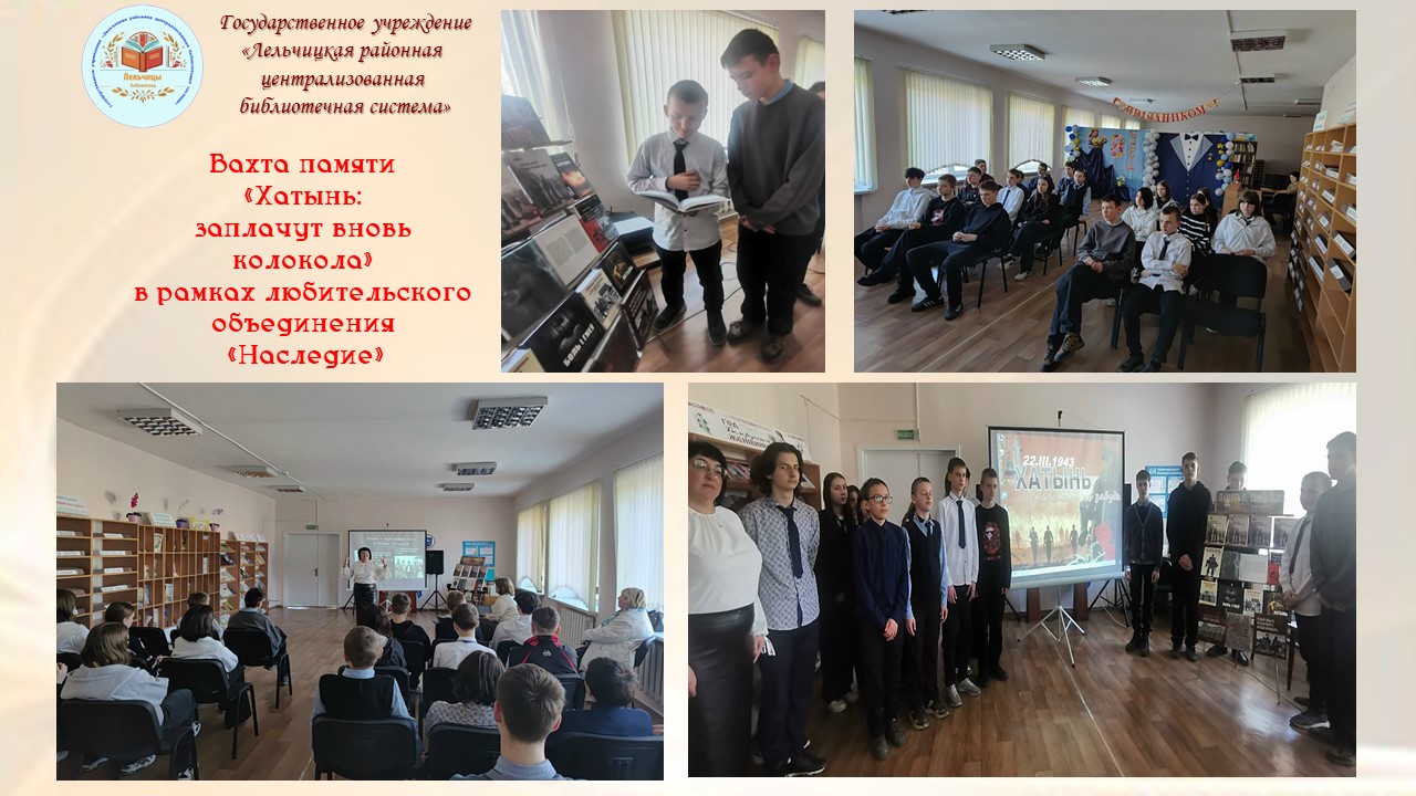 Пепел Хатыни — в сердце каждого белоруса. Это наша боль. Это наша память. Хатынь — наша неутолимая скорбь, наша всеобщая беда и вечная память. В рамках любительского объединения "Наследие" состоялась вахта памяти "Хатынь: заплачут вновь колокола", приуроченная Дню памяти жертв Хатынской трагедии. Участникам ведущая рассказала об ужасах войны, трагедии жителей д. Хатынь и других белорусских деревнях, а также о геноциде белорусского народа. В завершении мероприятия ребята посмотрели документальный фильм об этих скорбных местах.