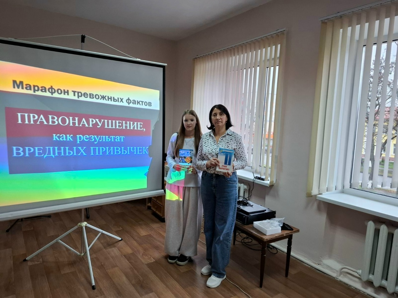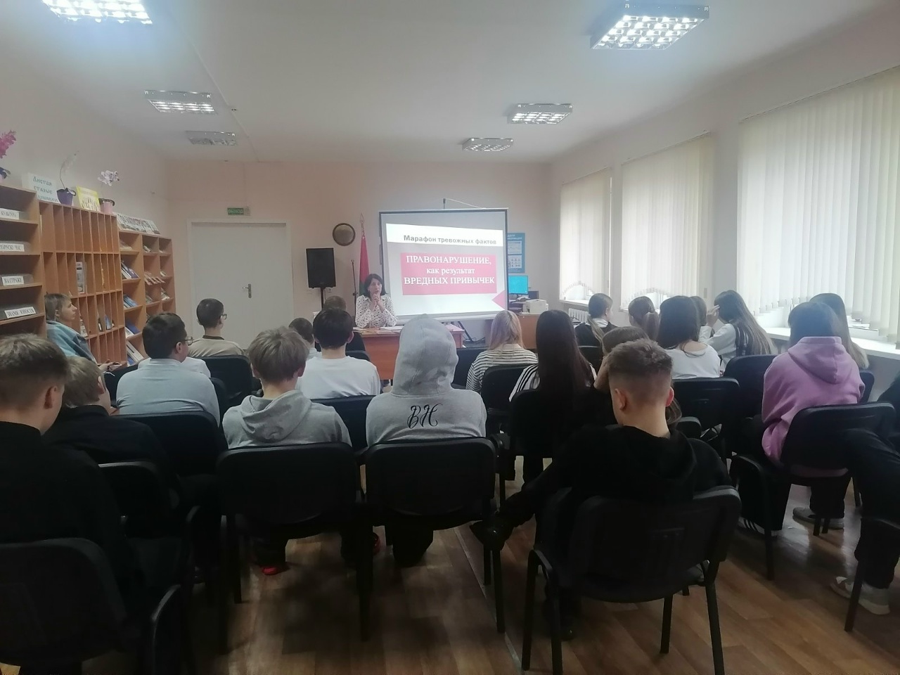 20 ноября 2025 года в государственном учреждении "Лельчицкая районная централизованная библиотечная система " в рамках любительского объединения "Фемида " состоялся марафон тревожных фактов "Правонарушение, как результат вредных привычек" с учащимися СШ2 9"Б" - 8 "Б"классов. В ходе мероприятия библиограф рассказала учащимся, что под правонарушением понимается неправомерное поведение человека, которое выражается в действии или бездействии. Правонарушениями не могут быть мысли, чувства, помыслы, так как они не попадают под регулирующее воздействие права, пока не выразятся в определённом поведенческом акте. В основном они происходят под влиянием вредных привычек. По смотрели видео "Вредные привычки и какой вред они приносят." В заключении мероприятия провели практическую часть.