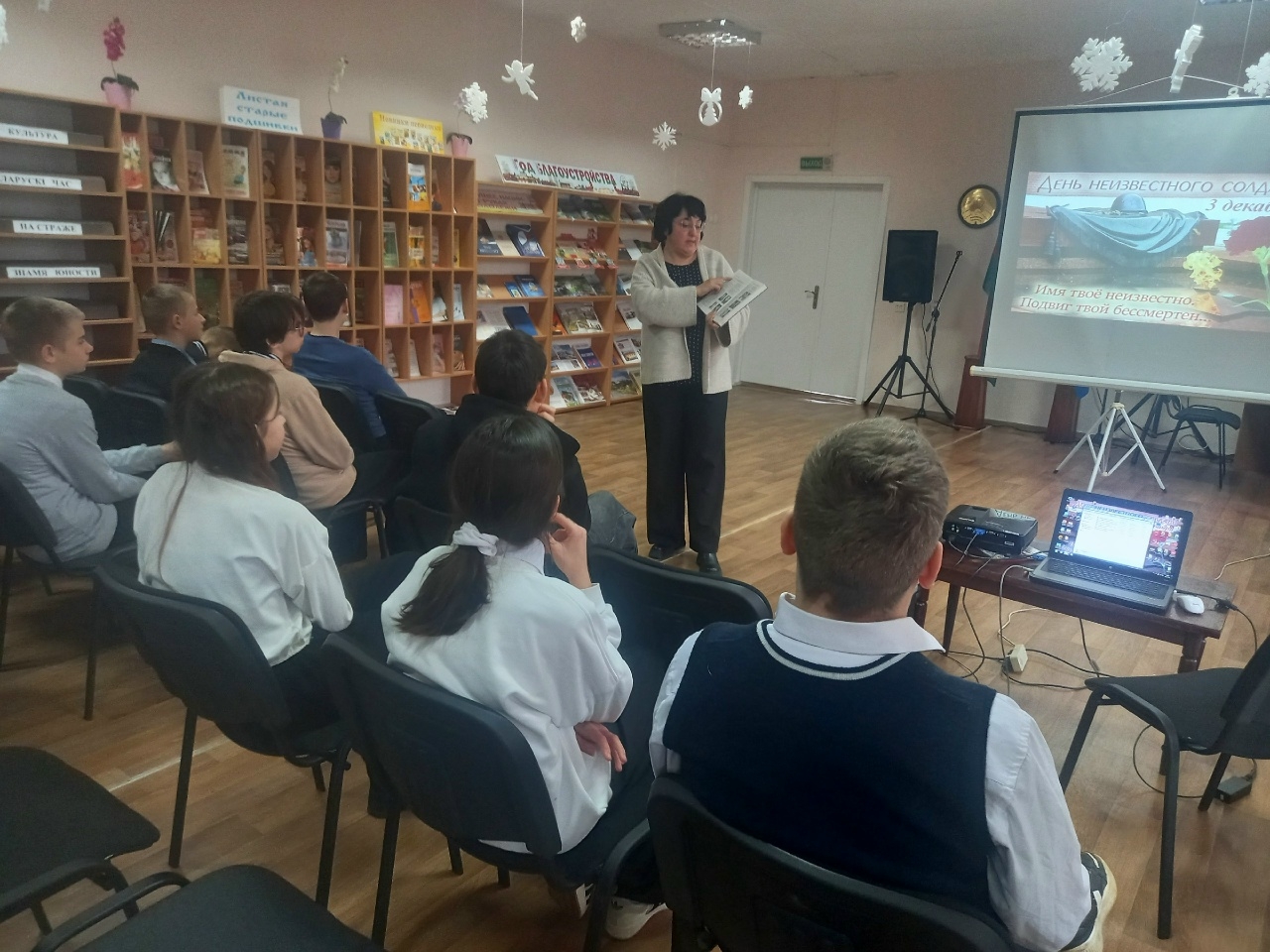 В Лельчицкой районной централизованной библиотечной системе для учащихся 4-х классов ГУО "Лельчицкая средняя школа № 2 им. М.Д. Некрашевича" и для участников любительского объединения "Наследие" был проведен цикл мероприятий, посвященных Дню неизвестного солдата. Ведущая рассказала о странах, где есть памятники неизвестному солдату, историю их создания, ребята просмотрели видеоролики на тему, а также продекламировали стихотворениях о солдатах.