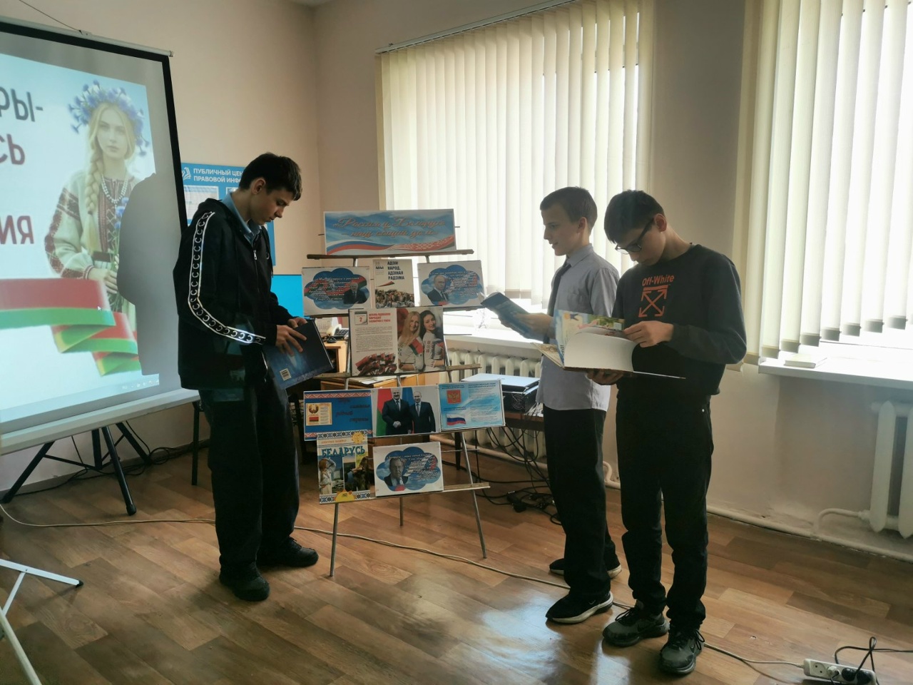 В рамках Дня единения России и Беларуси в государственном учреждении "Лельчицкая районная централизованная библиотечная система" прошла тематическая программа "Славянские сёстры Россия и Беларусь: мы едины" для учащихся 8 "А" и 8 "Б" классов ГУО "Лельчицкая средняя школа №2 им. М.Д. Некрашевича". Сотрудники библиотеки совместно с детьми листали страницы необычной книги, авторами которой являются два славянских народа – русский и белорусский. Общая история, традиции и обычаи… Мы живем вместе, мы так похожи, и все таки такие разные… На мероприятии ведущие рассказали о годах войны, о народных праздниках и обрядах о символах двух стран и многое другое. Финальным аккордом тематической программы стало собрание карты Беларуси под слова песни "Две сестры Беларусь и Россия". Также для ребят была подготовлена книжная выставка "Россия и Беларусь - наш общий дом".